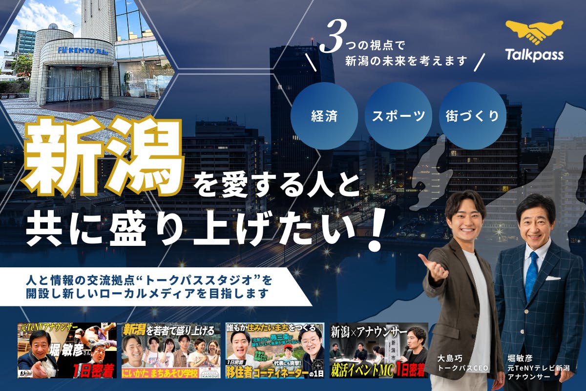 新潟駅南口から徒歩3分の場所に、2025年10月に「トークパススタジオ」が誕生します。このスタジオは、スポーツやビジネス、文化、暮らしなど多彩な新潟の“今”を国内外に届ける新しいローカルメディアの拠点です。代表の大島巧さんは、テレビ新潟での経験を活かし、地域の挑戦やストーリーを映像や配信で発信することを目指しています。新潟の魅力を可視化し、若者や県外の人々に届く情報発信の場として期待されています。