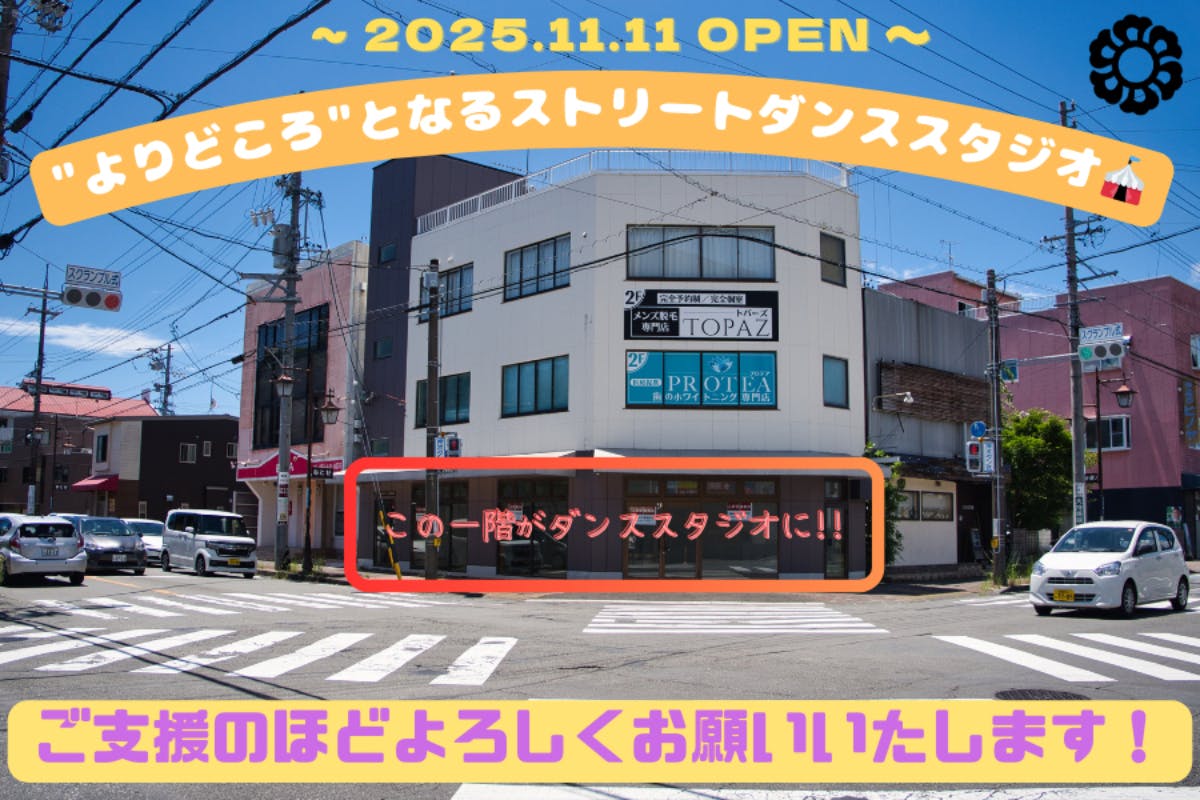 新スタジオは藤枝宿の大きな交差点沿いに位置し、蓮華寺池公園からも近い好立地です。ここを拠点に、地元イベントや店舗とのコラボ、カルチャー発信イベントなどを通じて、地域全体を盛り上げる場にしたいと考えています。単なる習い事の場ではなく、人と人がつながり、ダンス文化が広がる場所として、藤枝から全国へストリートダンスの魅力を発信する夢を描いています。詳しくはプロジェクトページをご覧ください。
