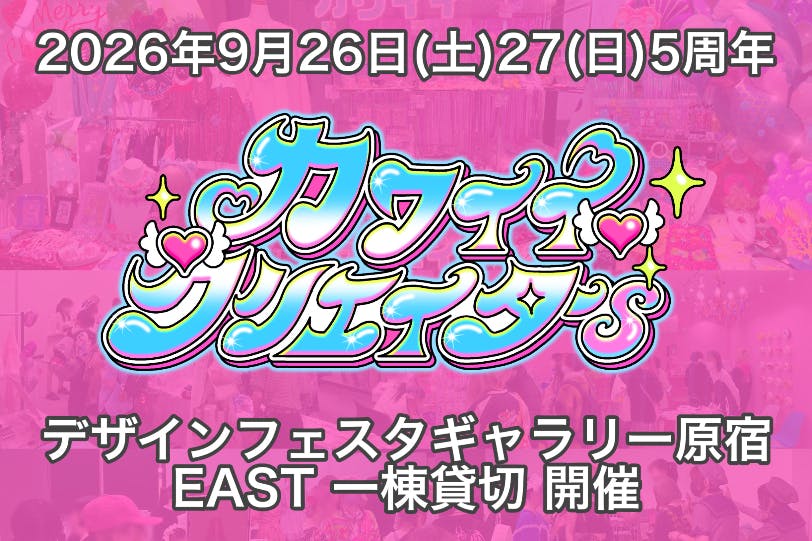 「カワイイクリエイターs」は、原宿ファッションとヤングカルチャーをテーマにしたハンドメイド・一次創作の即売会イベントです。2026年9月に5周年を迎え、節目の開催としてデザインフェスタギャラリー原宿のEAST館を一棟貸切で行われます。コロナ禍に小規模で始まったこのイベントは、今や多くのクリエイターとファンに支持され、原宿のカワイイ文化を体感できる場として成長しています。