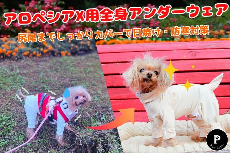 アロペシアXはワンちゃんの脱毛症の一種で、寒さや紫外線、皮膚の乾燥や痒みといった深刻な問題を引き起こします。特に毛が抜けてしまうことで、体温調節が難しくなり、日光による日焼けや皮膚の炎症、感染症のリスクも高まります。こうした悩みを抱えるワンちゃんのために、全身をしっかりとカバーし、肌を守るウェアの開発が進められています。