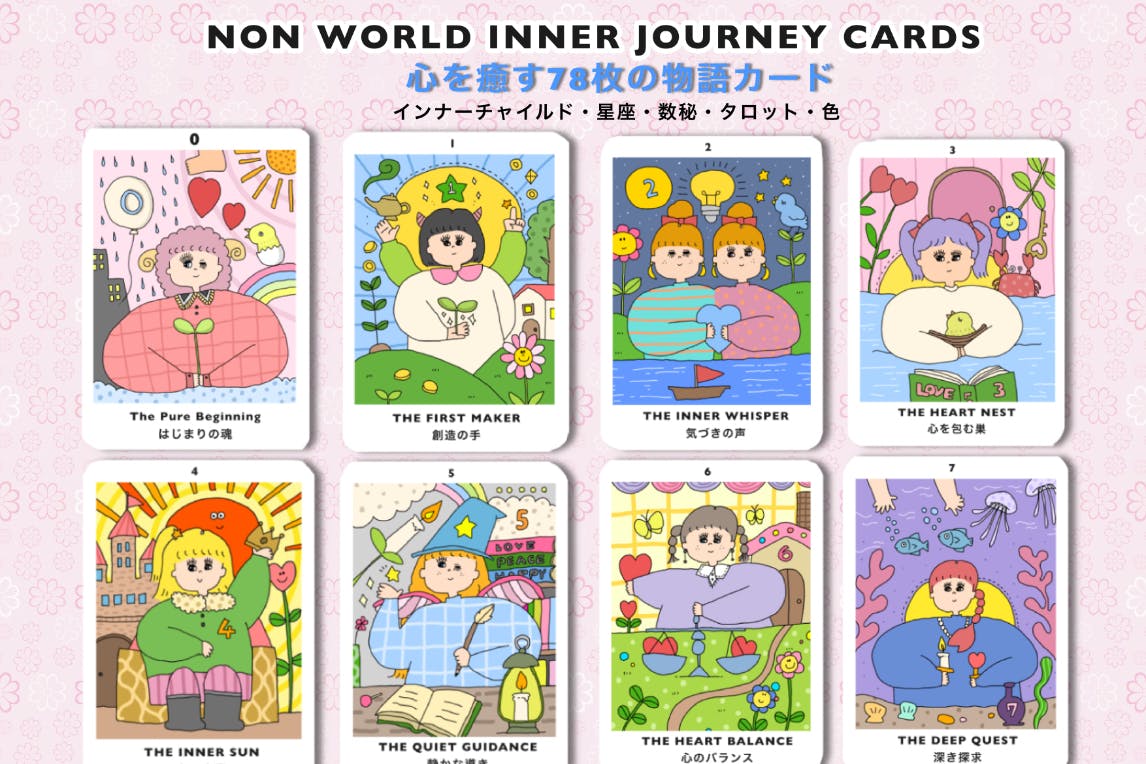 NONさんは過去に心のバランスを崩した経験があり、絵を描くことや物語に触れることで少しずつ心を癒してきました。その体験から「心が帰れる場所を作りたい」という想いが生まれ、NONWORLDという独自の世界観を創造しました。今回のカードは、その世界観をもとにインナーチャイルドや星座、数秘術、タロットの要素を統合し、78枚のカードにまとめています。カードをめくるたびに、自分の内面にある感情や気づきを優しく引き出してくれるデザインが特徴です。