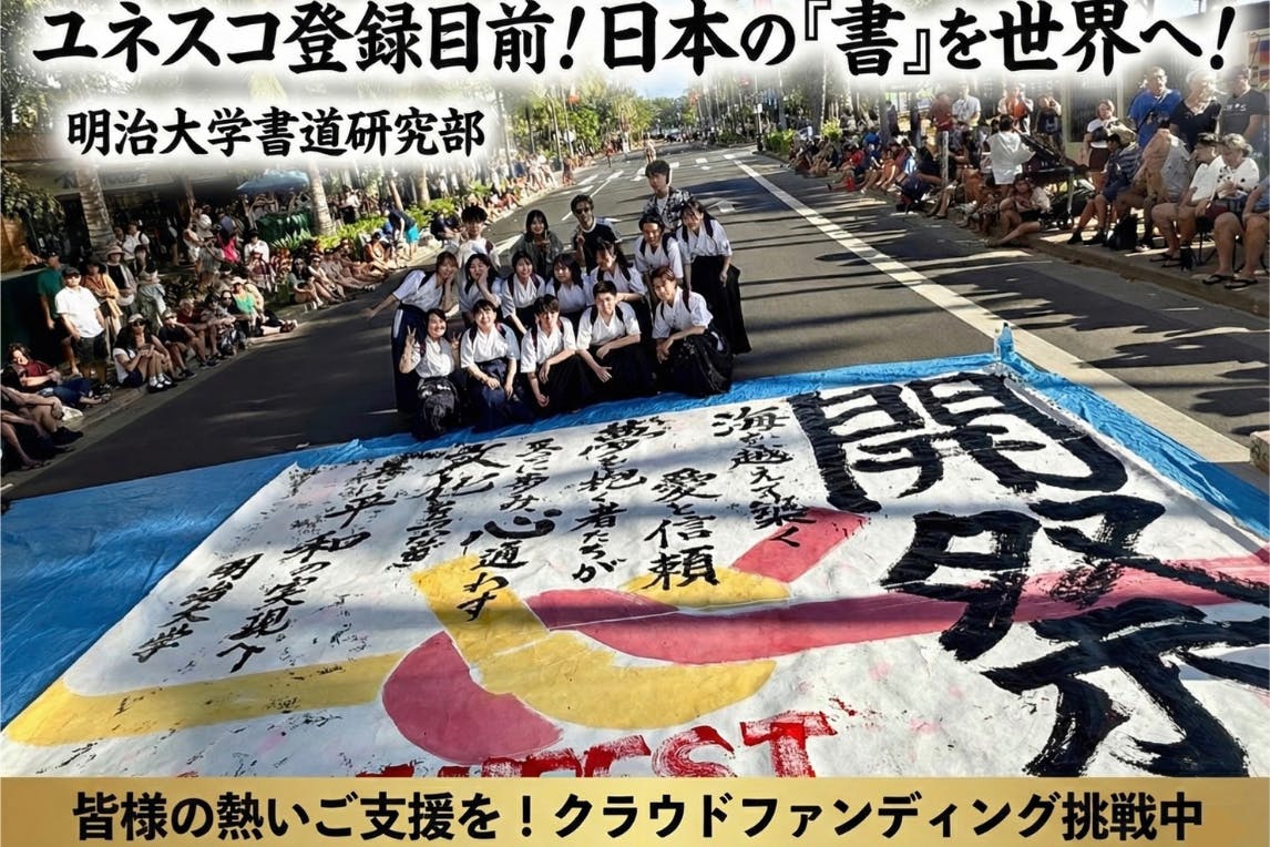 明治大学書道研究部は、確固たる伝統への敬意と未来への希望を胸に、書道を世界に広める挑戦を続けています。学生の力だけでは実現が難しい海外での活動ですが、書道の魅力を多くの人に伝えたいという熱い想いが原動力です。静かな古典の世界と躍動するパフォーマンス、その両方を通じて日本の伝統文化の新たな一面を世界に示そうとされています。書道が世界へ羽ばたくこの時代に、彼らの挑戦はまさに新しい歴史の1ページとなることでしょう。詳しくは、プロジェクトページをご確認ください。