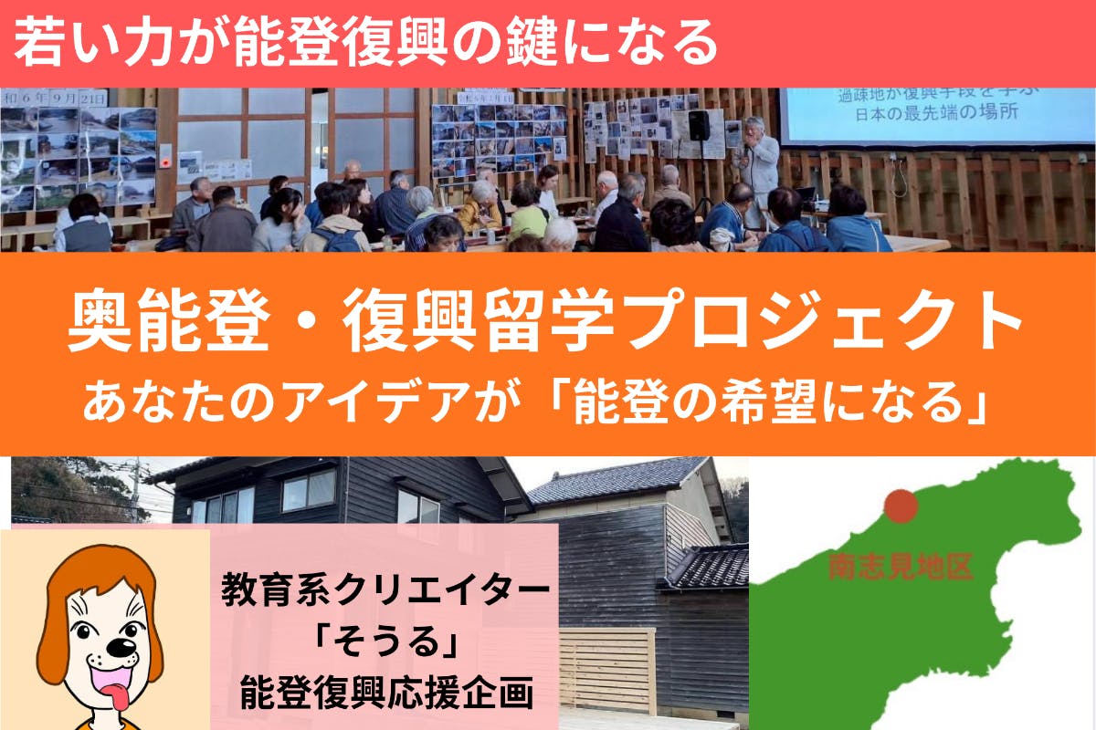 そうるさんは、ソーシャルメディアを通じて海外留学情報や奨学金制度を発信されており、世界の教育制度だけでなく日本の地域課題にも貢献できる人材育成を目指されています。今回、石川県輪島市南志見地区で「復興留学」×ビジネス・リーダーシップ研修を実施されることになりました。南志見地区は震災前から人口減少と高齢化が進み、震災後はさらに若年層の人材不足が深刻化しています。そうるさんは、単なる支援活動にとどまらず、商業や産業を通じた地域活性化を復興の鍵と捉え、次世代のリーダー育成に取り組まれています。