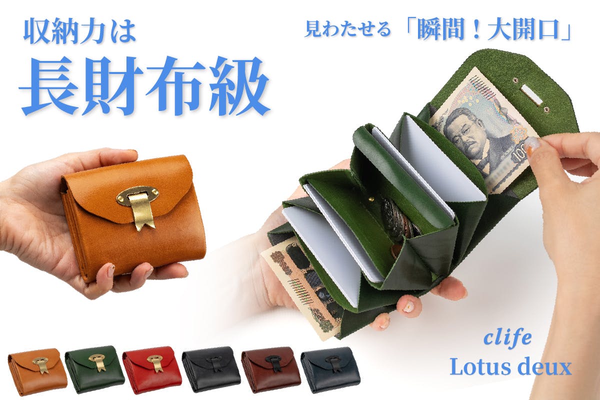 clife(クリフ)は企画・デザイン・試作・製作を自社で一貫して行い、金属加工と革加工の両方の技術を活かして独自性の高い製品を生み出しています。前作「Lotus」の購入者からの声を反映し、使いやすさやデザインをブラッシュアップした新モデル「Lotus deux」が誕生しました。小さなバッグやポーチにすっと収まる薄型設計で、持ち物を見直す方の新しい選択肢となることを目指しています。細部にまでこだわった素材選びと製作工程により、長く愛用できる財布に仕上がっています。詳しくは、プロジェクトページをご確認ください。