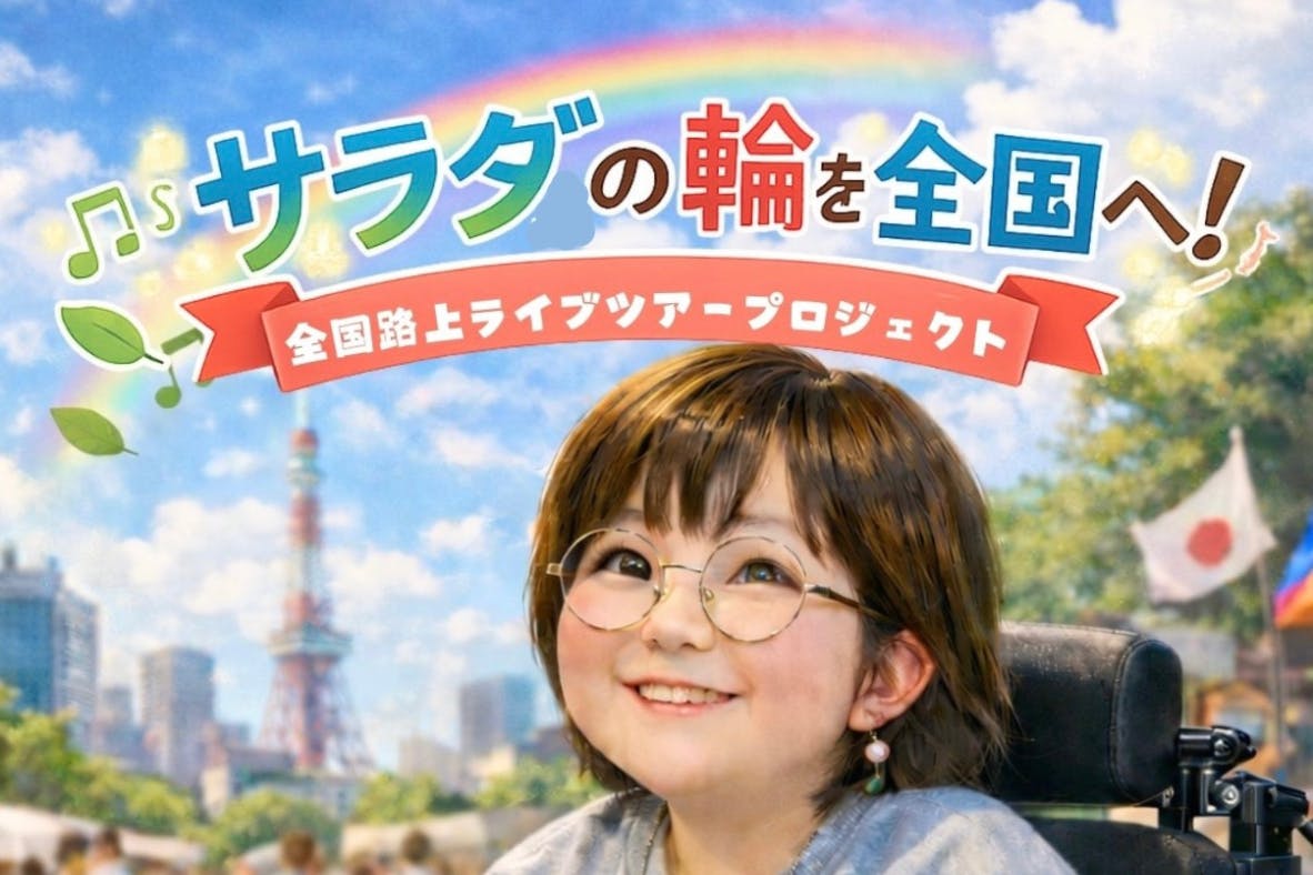 おりせさんは、ライブハウスの段差や環境の問題から路上ライブを選び、障害の有無や年齢、立場に関係なく音楽を共有できる場をつくってこられました。今年はその活動をさらに広げ、全国各地を巡る路上ライブツアーに挑戦されます。路上で「サラダ」を歌い、多くの人に共感の輪を広げることで、社会が少しでもあたたかくなることを願っておられます。これまでの経験を活かしながら、遠征費や機材費、ヘルパーさんへの謝礼などの準備を進めておられます。