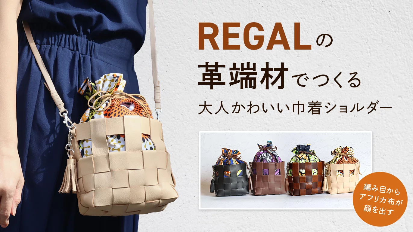 今回ご紹介するのは、REGALの靴づくりで生まれる革の端材と、鮮やかなアフリカ布の端布を組み合わせた大人かわいい巾着ショルダーです。靴の製造過程でどうしても使いきれない上質な革の端革を編み込み、そこにカラフルなアフリカ布の巾着袋を合わせることで、素材を無駄なく活かしたアップサイクル作品となっています。日本の伝統的な市松模様を思わせる編み込みデザインや、願いが叶うとされる叶結びのストラップなど、細部にまでこだわりが感じられます。