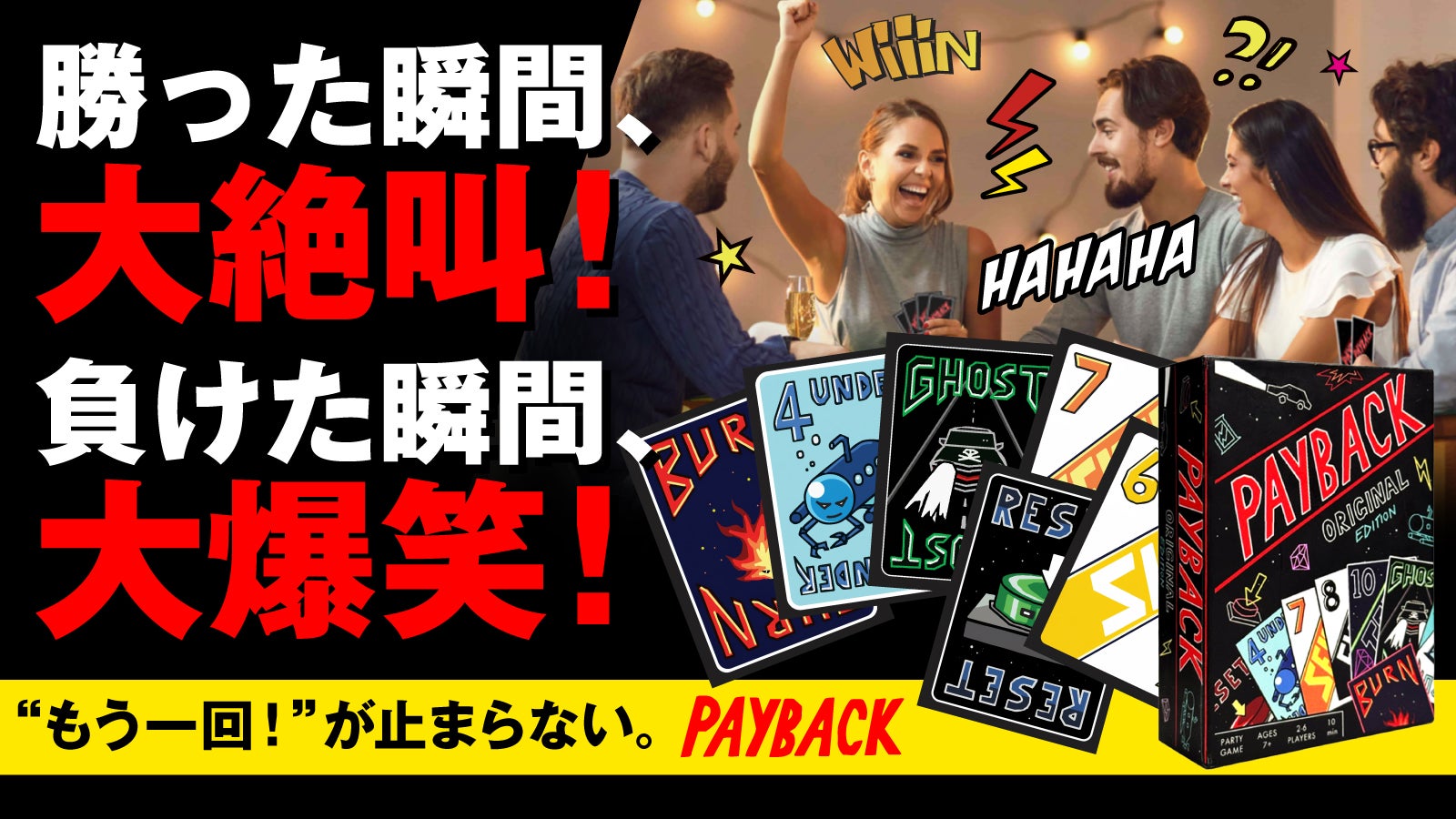 PAYBACKはアメリカ発の新感覚カードゲームで、シンプルなルールながらも戦略性と運が絶妙に絡み合う作品です。数字の大小だけで勝敗が決まるわけではなく、出すタイミングや相手の動きを読み切る心理戦が勝負の鍵となります。特に「チャンスカード」と呼ばれる5種類の特別なカードは、たった一枚でゲームの流れを一変させる力を持ち、最後まで目が離せない展開を生み出します。短時間でテンポよく進むため、気軽に何度も遊びたくなる魅力があります。
